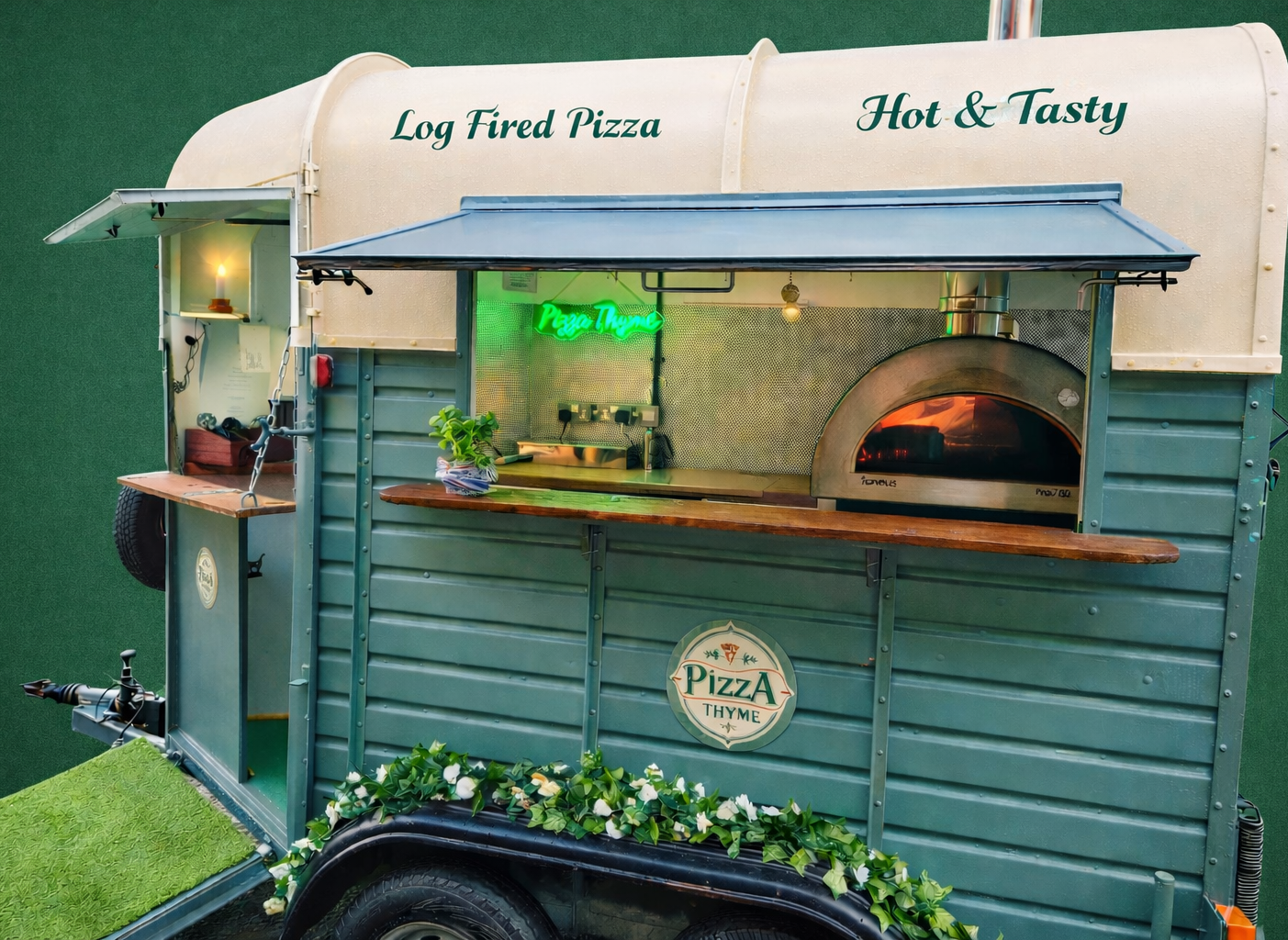Our converted vintage horse box trailer brings a warm, shabby chic charm to your special event in the Scottish Borders. Using only the freshest local ingredients, each sourdough pizza is cooked in a log-fired oven delivering authentic flavour and crisp character that makes every bite memorable.